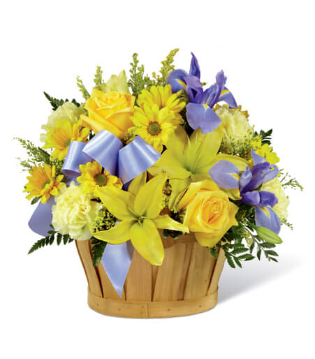 The solidago in the arrangement adds a beautiful pop of color that resembles a blue iris. It is accented with a blue satin ribbon and lush green leaves, and the oval woodchip basket it comes in makes it perfect for display in the center of the new baby's room, creating a warm and sunny ambiance.